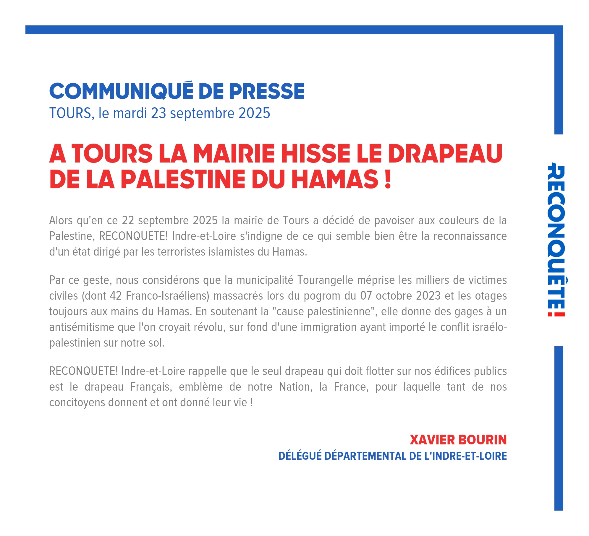 Alors qu'en ce 22 septembre 2025 la mairie de Tours a décidé de pavoiser aux couleurs de la Palestine, RECONQUETE! Indre-et-Loire s'indigne de ce qui semble bien être la reconnaissance d'un état dirigé par les terroristes islamistes du Hamas.